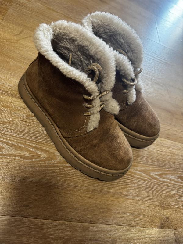 Удобные ботинки 37 размера, телесного ближе к коричневому цвету, внутри овчина, снаружи нубук, не промокают, очень теплые, не заметны следы эксплуатации.