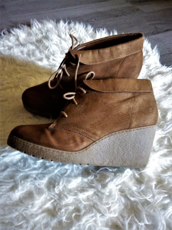 Ботинки- ботильоны экозамш на шнуровке, танкетке new look,высота танкетки 7 см, размер указан 5/38, потолка 25, подошва полиуретан.Очень легкие и удобные, высота вообще не чувствуется. Обмена и возврата нет! Примерки нет! Пожалуйста, совершайте покупку обдуманно, уточняйте все детали перед покупкой. С готовностью отвечу на интересующие вопросы. Доставка: Отправка Новой почтой каждый день после обеда.(кроме воскресенья) ❗️100% оплата на карту, не забывайте пожалуйста учитывать комиссию банка.❗️ - Наложки НЕТ! - Обмена и возврата нет.Примерки нет