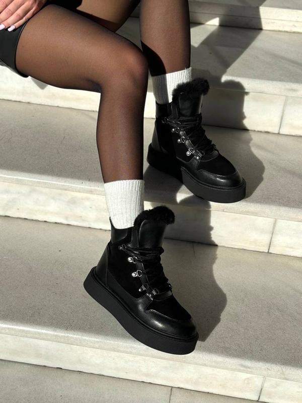 Код 22701 Размеры 37-40 Черевики Материал - НАТУР. ШКІРА/ЗАМША Внутри - Полушерсть 70/30 Сезон - Зима Цвет - Черный Высота от пятки - 13,5см Подошва - 4см/3,5см Производитель - Фабричный Китай На среднюю стопу Размер в размер 37-24 38-24,5 39-25 40-25,5