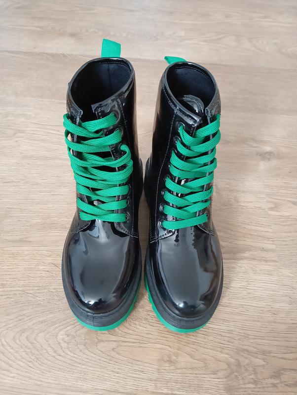Новейшие ботинки. Лакированные, что за материал не знаю. Но приятные, не дубовые, не трескаются. Размер 37, полномер. По стельке 24см. Высота с подошвой 21см. Подошва 5см.