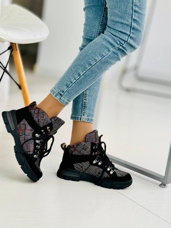 Наявність 36-23.5 см демі🍁 37-24 см зима ❄️ Код 5036 Матеріал верха : натуральна чорна замша + замша кольорова мозаїка + петелька в області пʼятки з шкіри флотар колір шоколад. Всередині демі - байка Всередині зима - хутро Материал підошви - терморезина Висота ботинка : 7 см Висота підошви: 2.5-3.5 см