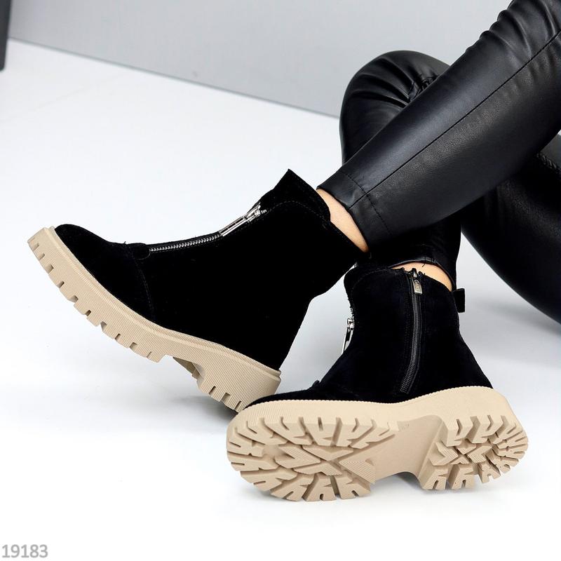 Код 19183 Размеры 36-40 Черевики Материал - НАТУР. ЗАМША Внутри - Полушерсть 70/30 Сезон - Зима Цвет - Черный/Беж Высота от пятки - 13см Подошва - 5см/3см Рабочая молния сбоку, спереди - декор Производитель - Украина На среднюю стопу Размер в размер 36-23 37-24 38-24,5 39-25 40-26