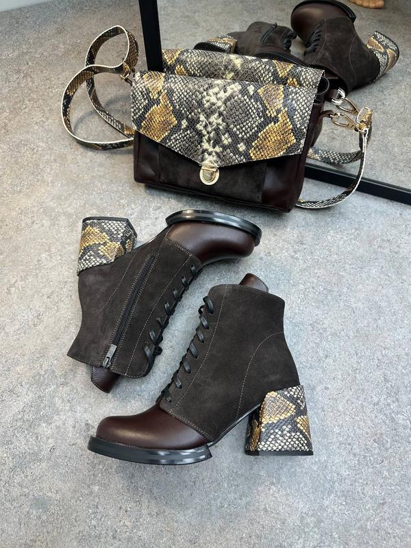 Ботинки из натуральной итальянской кожи и замши женские на каблуках коричневые шоколадные