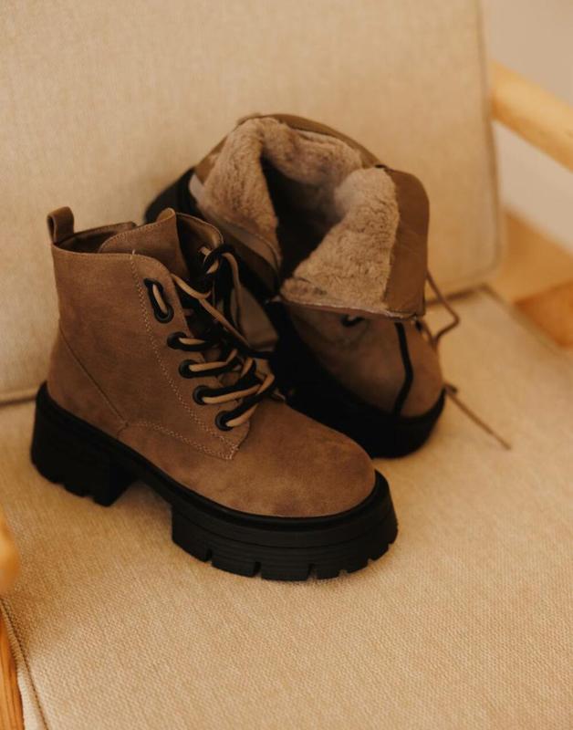 Имеют двойную шнуровку и молнию сбоку. Утепленные полностью натуральным мехом. Материал: эко замша. Высота подошвы: 4-5 см. Размер 39, стелька 25 см. Полностью новые, в коробке.