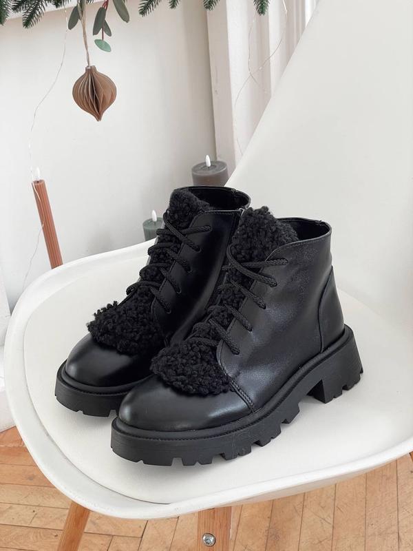 Черные кожаные утепленные ботинки на шнуровке и замочек сбоку, со вставками тедди меха Сезон: Зима ( набивная овчина) Украинский производитель Платформа: 2,5-4,5 см Высота: 10,5 см ( до пятки) На среднюю ножку Размер в размер Размер по сетке: 37 - 24 см 38 - 24,5 см 39 - 25 см 40 - 25,5 см 41 - 26 см Код 9845