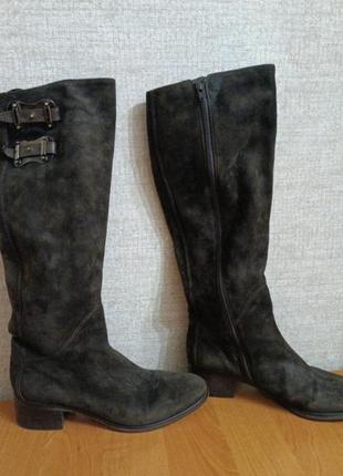 колir коричневый (шоколад), верх замш, в средние шкира, размир 39(будт на 38), чуть маломерть, не на очень широкую ножку, по сотке 24см, каблук 4см, высота 44см, обьем голенища верх 35см, объёмом по средние 31см, на киксти обьем 27.Ilia.