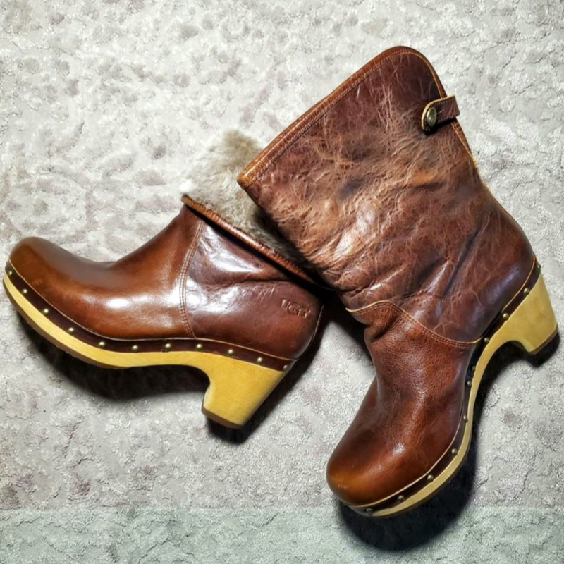 Цвет коньячный, подошва деревянная. Кожа глаженка извне, внутри мех. Можно развернуть, или свернуть мехом наружу. Размер 6 (американский), 37 (европейский). Надела несколько раз, состояние очень хорошее.