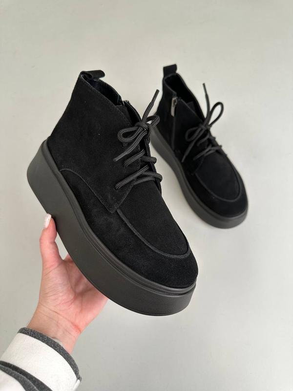 Модель 9931-1 Сезон: демі/зима Размеры: 36-41 Цвет: черный Материал верха: натуральная замша Внутри: байка/полушерсть Материал подошвы: ТЕП Высота подошвы: 4,5-5,5см Высота без подошвы: 9см Производитель Украина Размеры в наличии: 37 37 38 38 38 39 39 40 41 Стелька: 36-23,5см 37-24см 38-24,5-25см 39-25,5см 40-26см 41-26,5см, на середню ногу цена: - 3050 грн Пошив - нет ⛔️