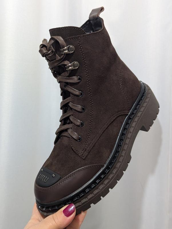 пропоную стильну новинку цього сезону Жіночі черевики з натуральної замші Українське пошиття, натуральна замша комбінована з натуральною шкірою, фурнітура міу на носку Підошва поліуретан Утеплені шерстю , сезон зима Шнурівка і збоку замок Шикарна моделька , на ніжці комфортні В наявності в 2 кольорах: шоколад і чорні Розміри повномірні 36-23,5 37-24 38-24,5 39-25,5 40-26 41-26,5 передоплата повна чи частково 140грн