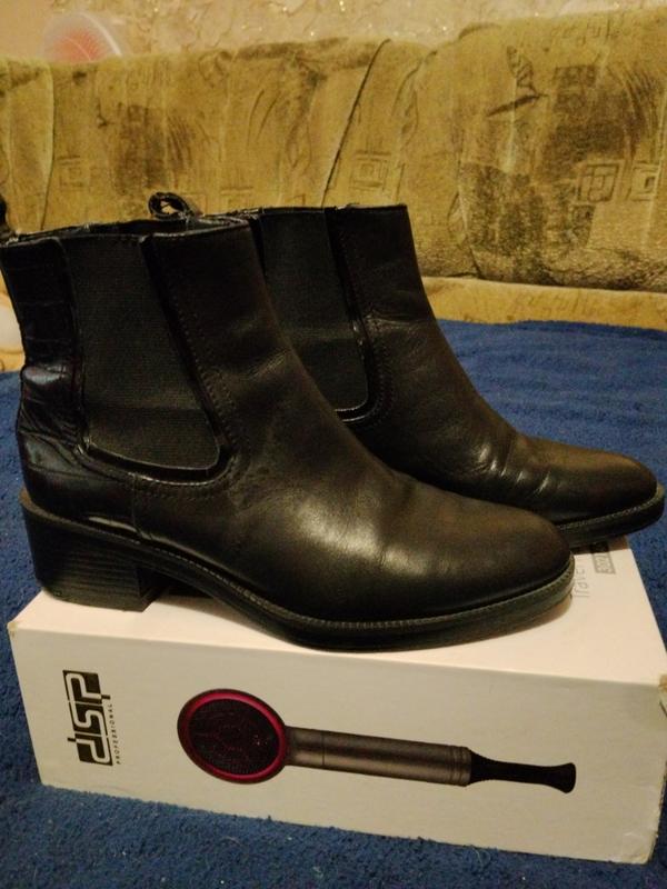 очень красивые черные удобные ботинки.По бокам на резинке.Размер 35-36. опис состояние отлочный высота с каблуком 16,5 каблук 4 длина стельки 23
