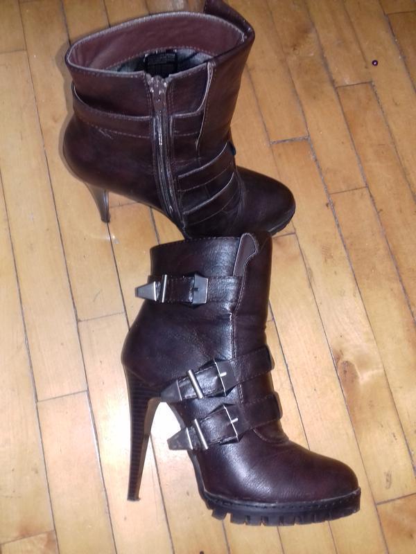 Коричневі черевики з пряжками. Одягалися 2-3рази,в дуже хорошому стані. Шкірзамінник. Розмір 40.-прибл 25,5-26см стелька. Каблук- 12см