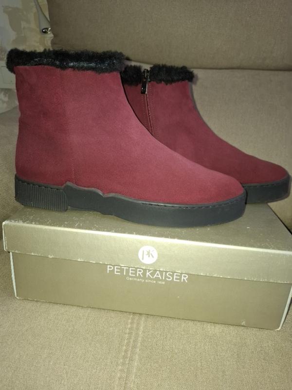Ботинки известного немецкого бренда Peter Kaiser в замше цвета бургунди (в жизни темнее, чем на фото. Утепленные мехом черного цвета, на молнии. Длина стельки 25 см, ширина 8 см. Высота платформы 2,5 см. Стан очень хорош. Удобные.