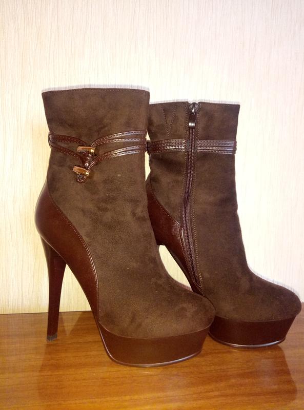 Практически новые ботыльены. Одеты были один раз, в ресторан. Очень удобные в носке. Цвет: темно-коричневые Высота каблука: 13 см. Высота платформы: 3см.