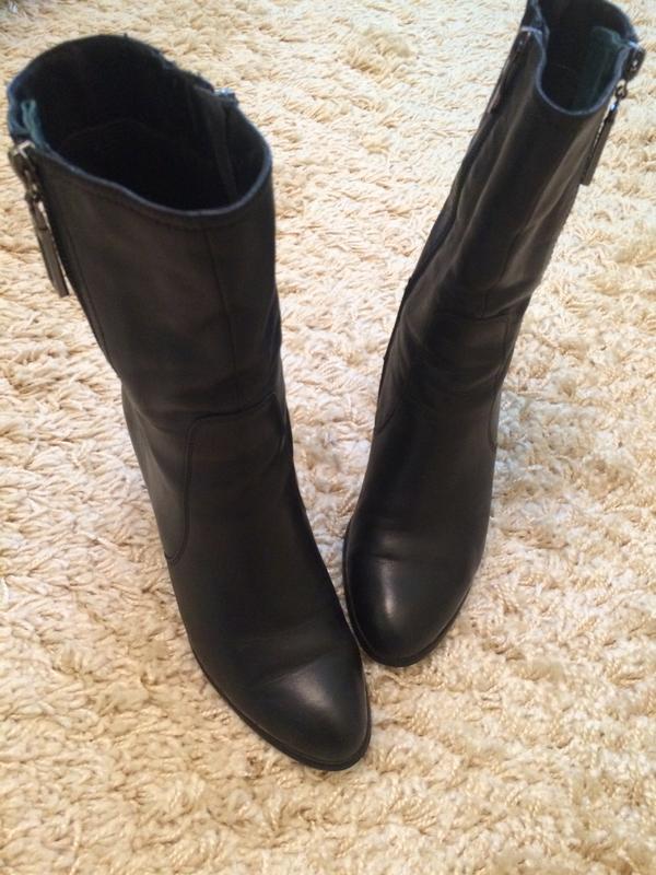 Демисезонные ботинки из натуральной кожи в отличном состоянии. Никаких трещин и потертостей. Есть один нюанс - на внутренней стороне пятки немного содрана кожа. В носке совершенно не видно, т.к. это внутренняя сторона. Высота каблука - 7 см, общая высота ботинка - 26 см, длина стельки - 23,5 см.
