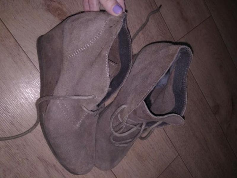 Продам замшевые коричневые ботиночки на танкетке красивого кофейного оттенка. Были обуты несколько раз. Явных следов носки нет. Длина стельки внутри 24см