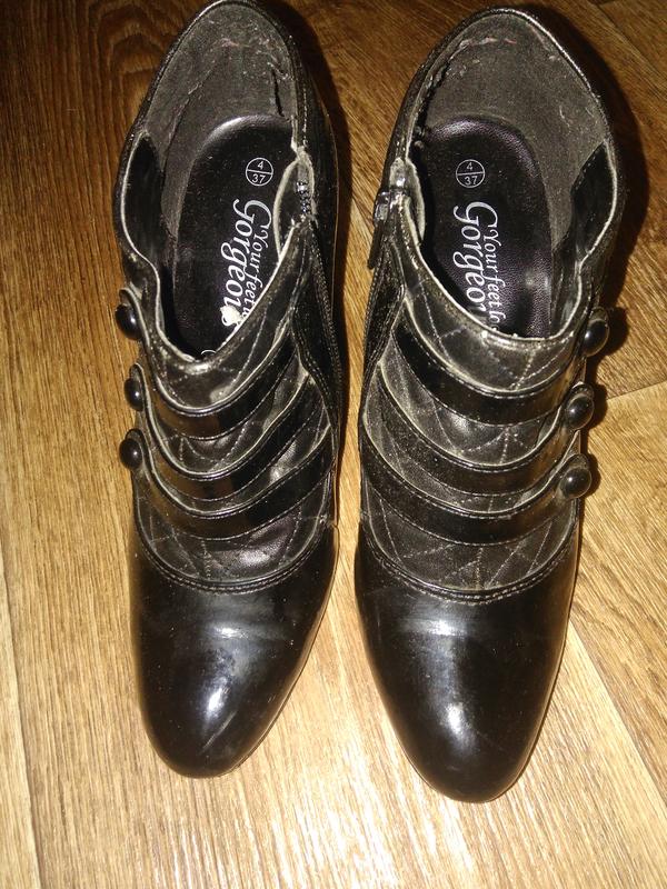 Поцарапан низ каблука (на фото) и одна пуговичка. Длина стельки 24 см, каблук 9 см. Железные набойки.
