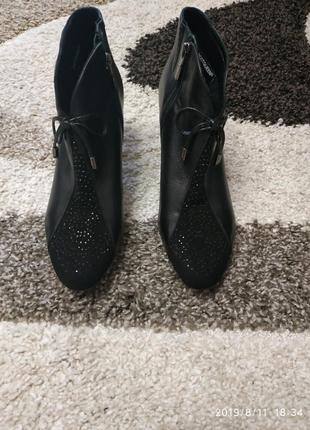 Продам новые женские кожаные ботиночки, на невысоком каблуке 7 см. Впереди декорированы вставкой из замши и камушками. Ни разу не были обуты. Размер 39. Ботиночки демисезонные,очень элегантно смотрятся на ножке.
