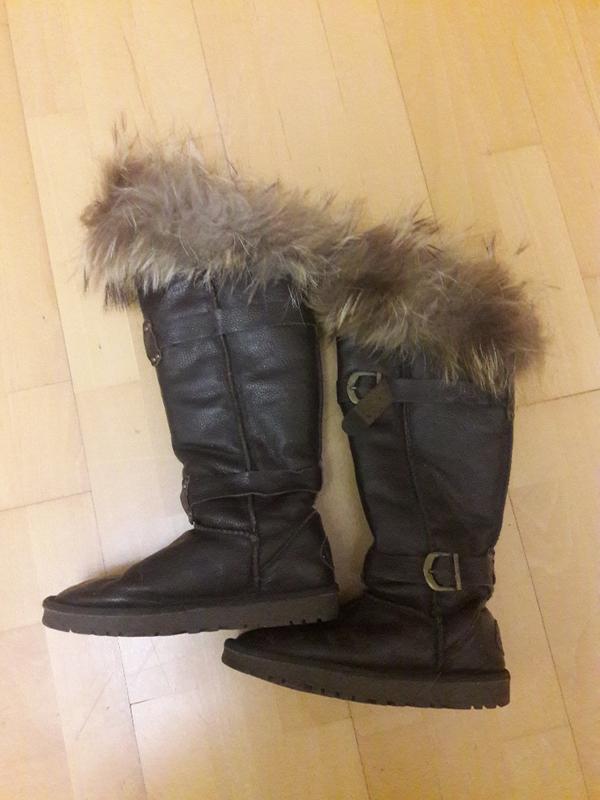 Высокие угги темно - коричневого цвета на толстом меху . Высота голенища 32 см. Длина стельки 22,5 см.