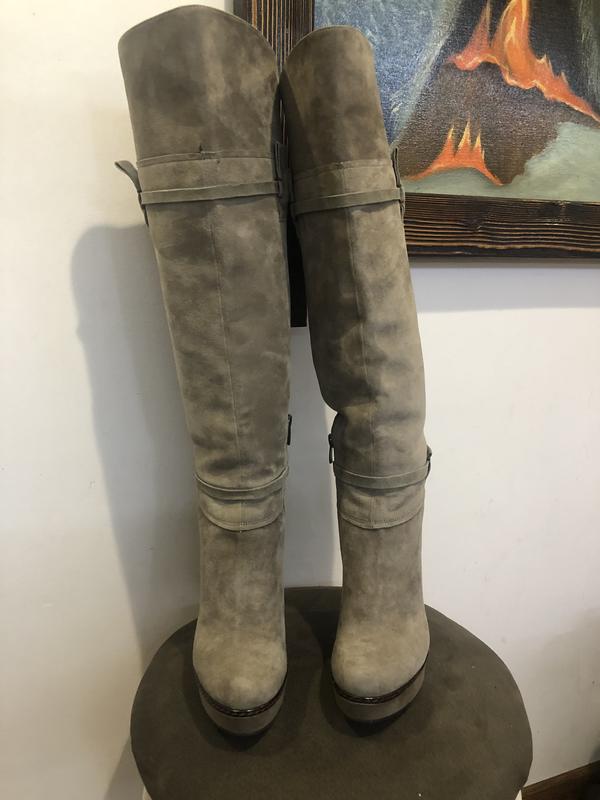 Замшевые сапоги очень высокого качества , внутри кожа. Голенище плотное , держит форму. Смотрятся очень стильно и дорого.