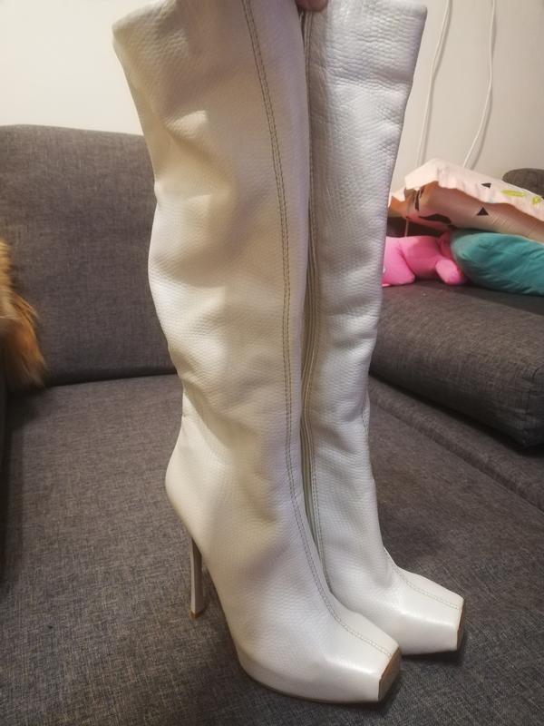 Сапоги на платформе, каблук 13 см. Очень мягкая кожа, внутри ткань. Мягкие и лёгкие. Носок золотой металл . Одевались пару раз и то в помещении, по подошве и каблуку видно . стелька приблизно 23/23.4/24 . на вузьку ніжку.
