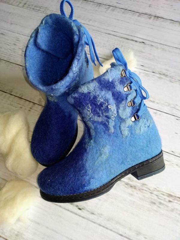 Валенки ручной валки из натуральной шерсти. Авторская работа в едином экземпляре. Внизу толстые и плотные с переходом от голубого к синему, сверху тонкие, украшены кудрями и шнуровкой. Удобная зимняя подошва в тон валенкам, эластичная. Размер 37 Лёгкие по весу, мягкие и тёплые, хорошо держат форму для повседневной носки. Отлично будут сочетаться з джинсами.