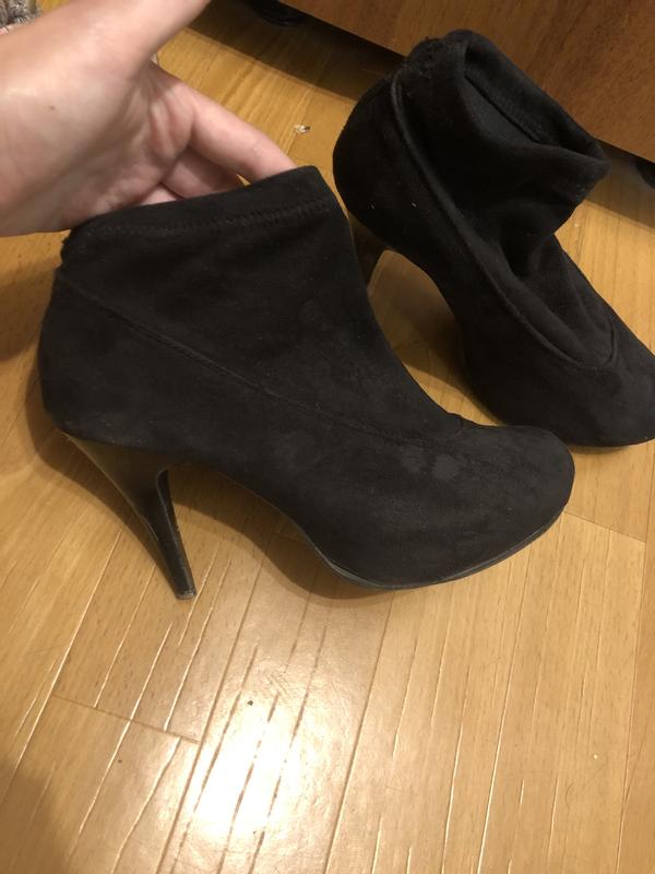 Чёрные замшевые ботильоны-носки 38 размера. Удобные, устойчивые. Каблук невысокий.