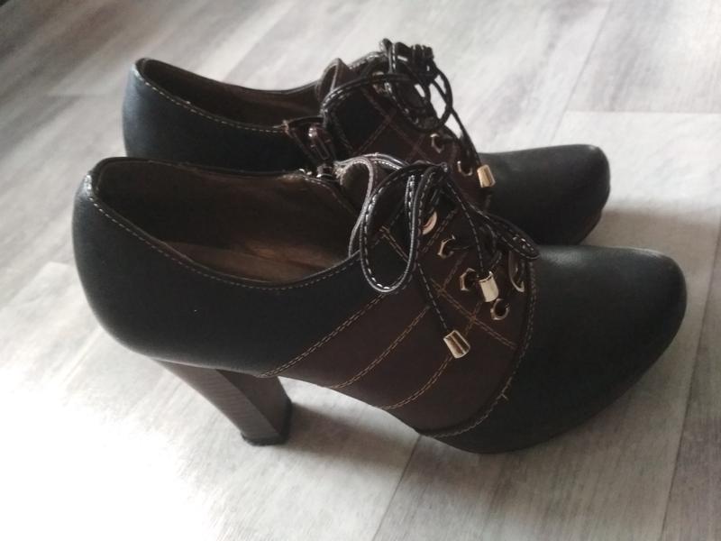 Ботильоны, размер 36, черно- коричневые, длина по стельке 23,5 см, спереди шнурок, по бокам молния, высота каблука- 9,8 см, спереди платформа 1,5 см.