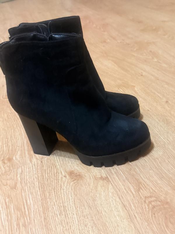 Размер 36,материал искусственная замша, выглядят красиво на ножке и очень удобны, красиво чистятся. Высота каблука10см платформа 2,5см.Если нужно то сделать дополнительно фото, вращайтесь.