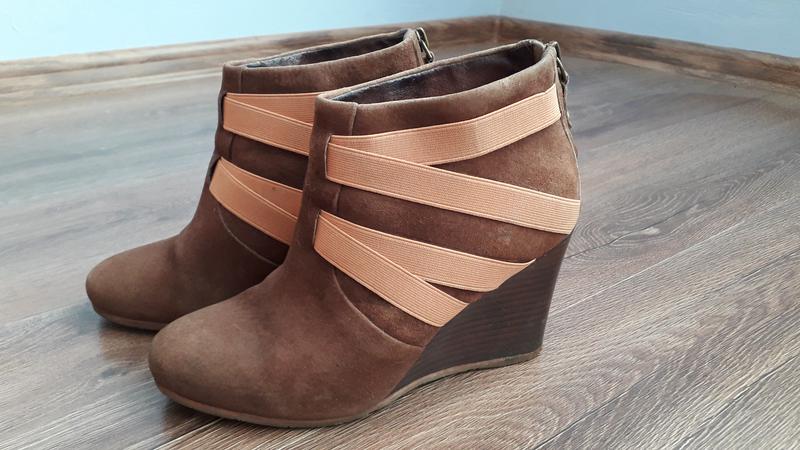 Утеплённая стелька, удобная танкеточка, натуратьная страусиная кожа. Интересный дизайн, на ножке шикарны. Есть небольшие следы носки, и маленький нюанс на каблучке, абсолютно не заметный в носке. Стелька 24,5, на узкую ножку, или 24 на среднюю. Высота танкетки по внешнему ребру 8,5см.