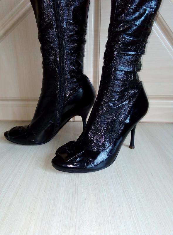 Очень красивые нарядные сапоги-чулки, 37 р. Нат. кожа, лак. Состояние полностью новых. Стелька : 24-24,5 см, на среднюю стопу. Очень удобные и мягкие внутри, удобнейшая посадка, устойчивые : шпилька практически не чувствуется. Высокого качества. При желании, можно покрасить набойку в черный цвет или поставить набойку -шпильку( без расширения). Внутри утеплены тонким слоем искусственнго меха. Сапоги выглядят изумительно дорого, изящно , элегантно и стильно на ноге, придают шик. Больше фото по запросу.