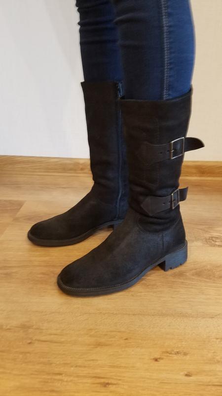 Кожаные ботинки на каучуковой подошве. Внутри мяшкая тканевая подкладка. Цвет графитный. Указан размер 36 , стелька 24 см висота без каблука 29 см.