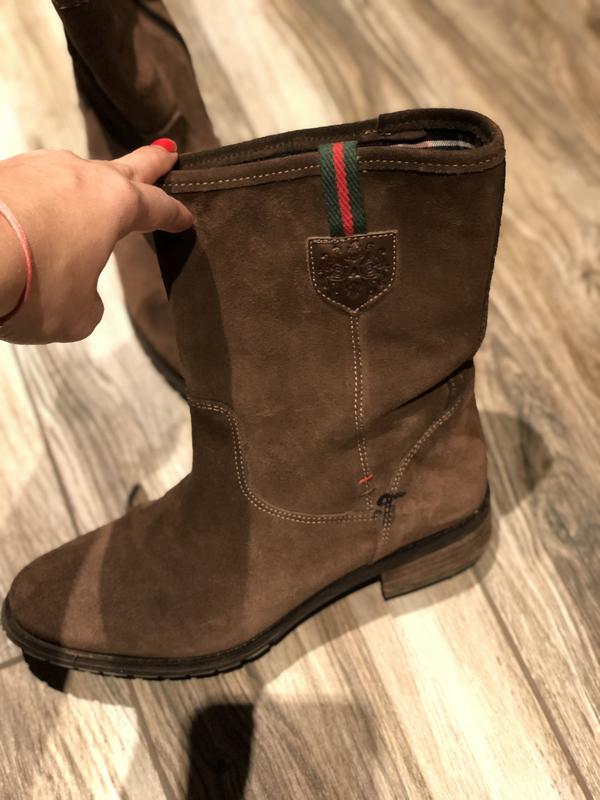 Замшевые ботинки, покупались в Испании за дорого, в носке были не много, на фото видно дефекты на каблучке и пятнышко на ботинке в носке не видно.