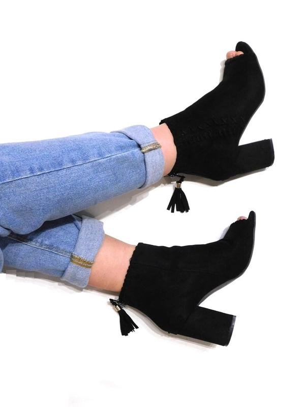 Стильные ботиночки из искусственной замши с открытыми пальцами. Декорированы отделкой плетением. Устойчивый каблук. На пятке застегиваются на молнию с собачкой-кисточкой. Размер 37(4), подойдет на наш 36 идеально на стопу в 23.5 см Высотка каблука -7,5 см