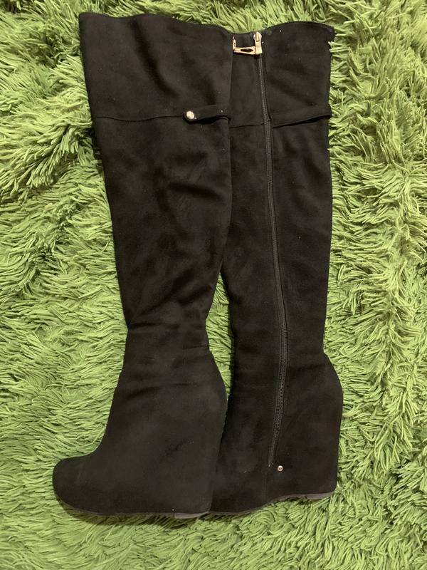 Продам чёрные замшивые ботфорты на платформе Высота платформы 10 см Указан размер 38 но идут на 37 Очень удобные и легкие Есть дефект который виден на последнем фото, но эти потёртостей при носке не заметны