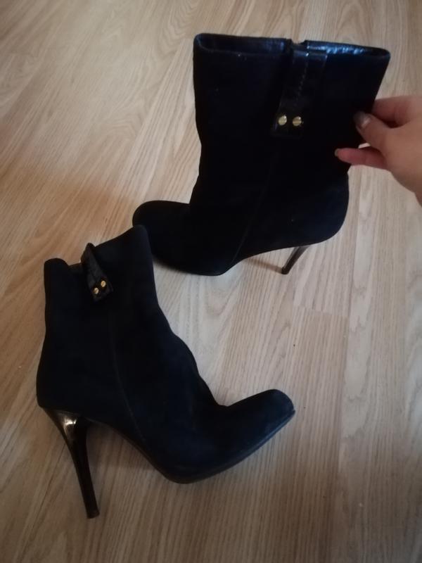 Красиві ботінки на високому каблучку. Неймовірно виглядають на ніжці, розмір 40, трішки подерті на каблуках, в носівлі не помітні. Висота каблука - 10,5 см Довжина устілки - 25 см