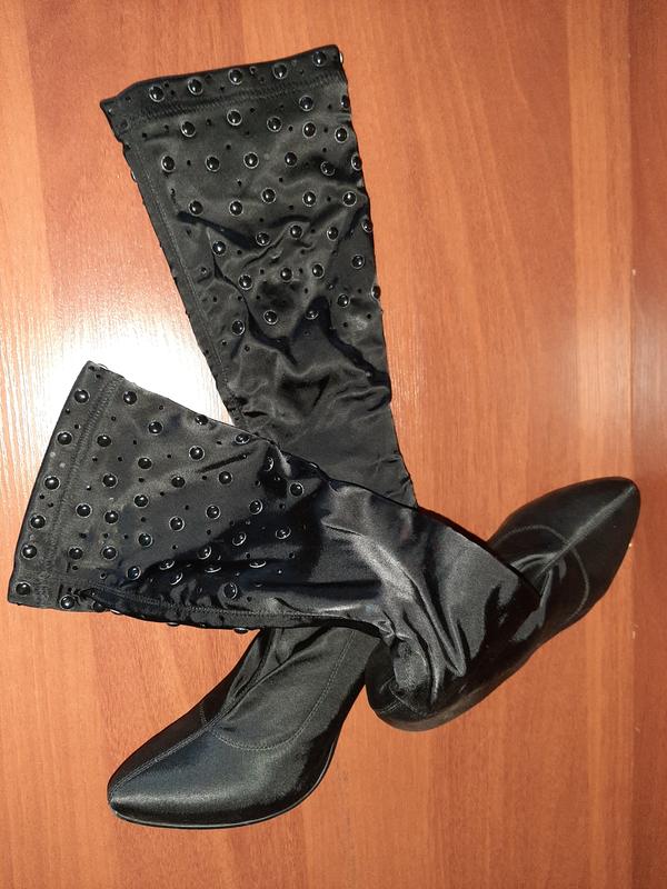 Сапоги-чулки из эластичной плотной ткани, украшенные сверху камушками.