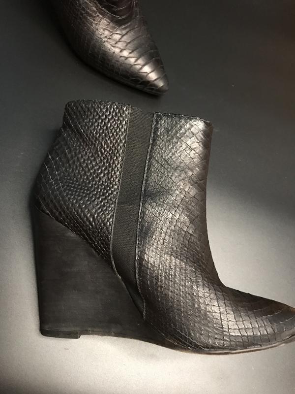 Кожаные ботильоны Moss Copenhagen на танкетке 10см, сделана профилактика носка и набойки, есть маленькая царапина сзади на танкетке {видно на фото}. Очень клёвые и удобные, размер указан 40{25,5см}, носила на 39