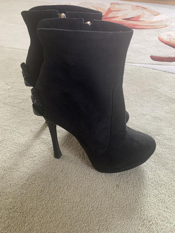 Дуже класні чобітки на високому каблуку, стан ідеальний, каблук 13 см, платформа 1,5 см. Оздоблені ззаді бантом і камінням.