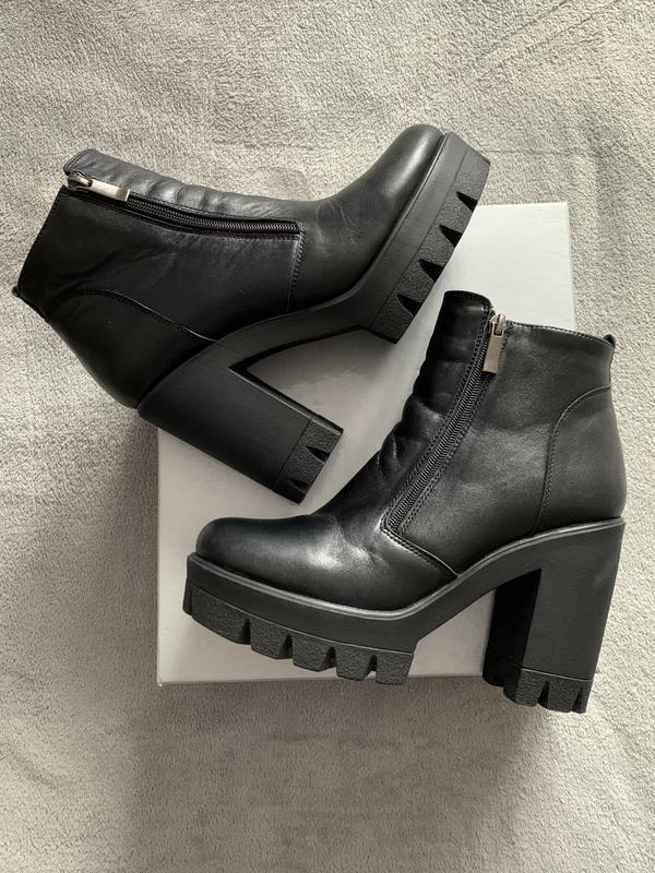 Чорні черевики з натуральної шкіри. Сезон зима❄️ Завдяки товстій підошві забезпечують комфорт і зручність при ходьбі😊 Таке взуття підходить до багатьох образів. Розмір 39. Довжина устілки 25,5-26 см. Загальна довжина каблука з платформою 11 без 9 см. Виробництво -Туреччина. Стан ідеальний, взувала один раз