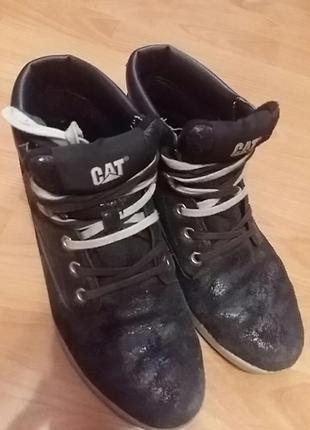 Ботинки Caterpillar. Размер 38 Eu. Длина стельки 23.5 см. Верх - нубок, цвет не совсем черный, а " мокрый асфальт" с блеском. Внутри утепеление шерстяной тканью. Все целое. Коробка сохранилась. Недостатки: чуть протерлась ткань внутри на пятке и делали профилактику сзади, потому что стерлась подошва сбоку.