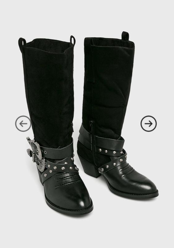 Крутые сапожки-казаки, с бляшками, на невысоком устойчивом каблучке, сбоку на молнии, верхняя часть - иск замша, нижняя - кожзам Размер 37,5, садятся отлично на ногу 23,5 см, но я от каблуков отекаю и мне жмут, сядут идеально на 23см Состояние идеальное, я обула раза два