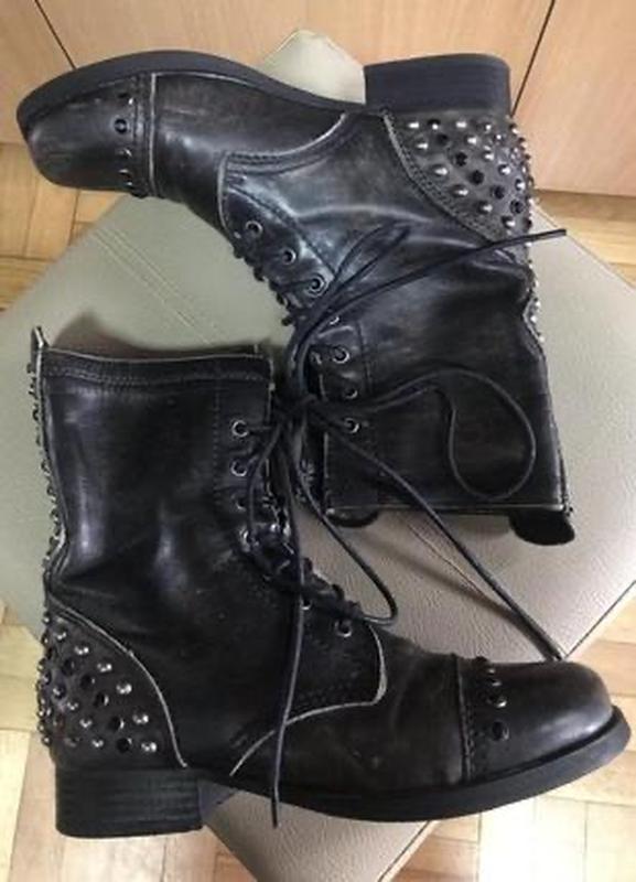 Стильні шкіряні черевики Aldo. Матеріал-шкіра,зроблена під Денис. Прикрашені стразами (бурштинового і чорного кольору) Фурнітура-темний нікель. Розмір 38-устілка 24,5-25 Стан відмінний,втрачено один стразики(на фото). В шкарпетці не видно.