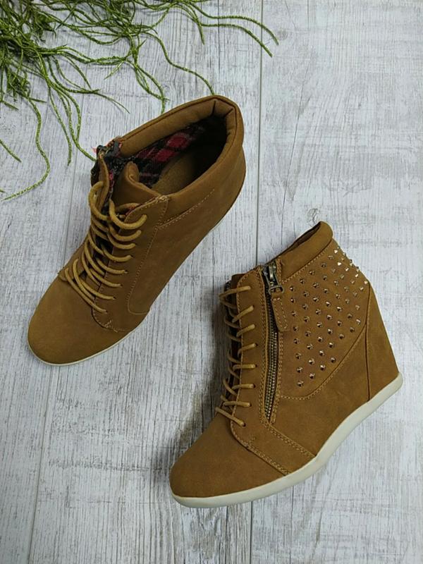 Ботинки изготовлены из экокожи, подкладка текстиль,молния декоративная, высота танкетки 8.5 см.Длину стельки производитель пишет 26 см. но по факту 25 см. (смотрите на фото) Без дефектов.