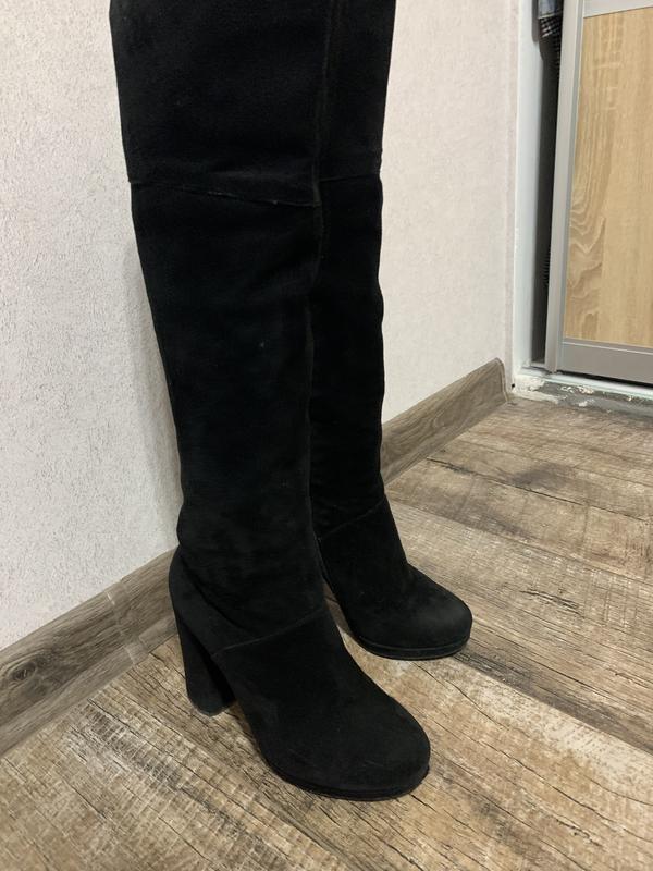Натуральный замш, очень устойчивый каблук, внутри европейка натуральная цигейка, не сбитая