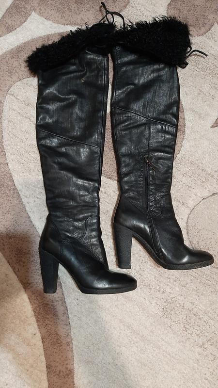 Классные удобные ботфорды из мягкой кожи ,красиво облигает ногу, по верху отделанна мехом , можно носить как с отворотом так и без, колодка очень удобная, евро зима внизу на цигейке, вверху войлок длина стельки 23,5-24, высота каблука 10 см.