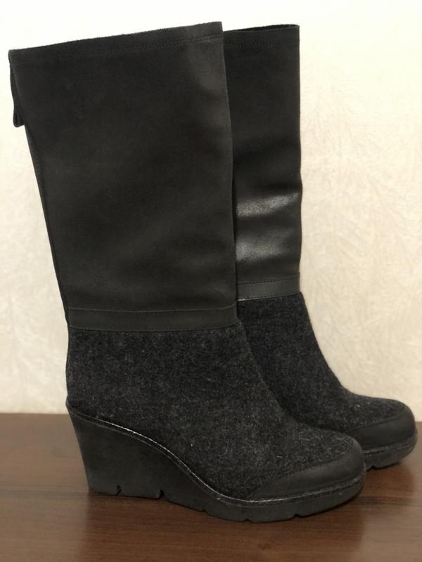Сапоги зимние, танкетка 7 см, размер 37 , по стельке 23,5. Нубук и войлок , смотрятся стильно, внутри чёрная овчинка .