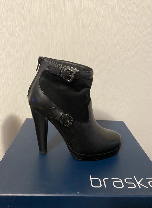 Ботильены ТМ braska. Размер 37. Практически не носились, видно по состоянии подошвы. Набойки были заменены сразу. Есть небольшая царапина спереди на торце. Делала фото макросьемкой, когда ботильены на ножке, ее практически не видно. Бережное хранение.