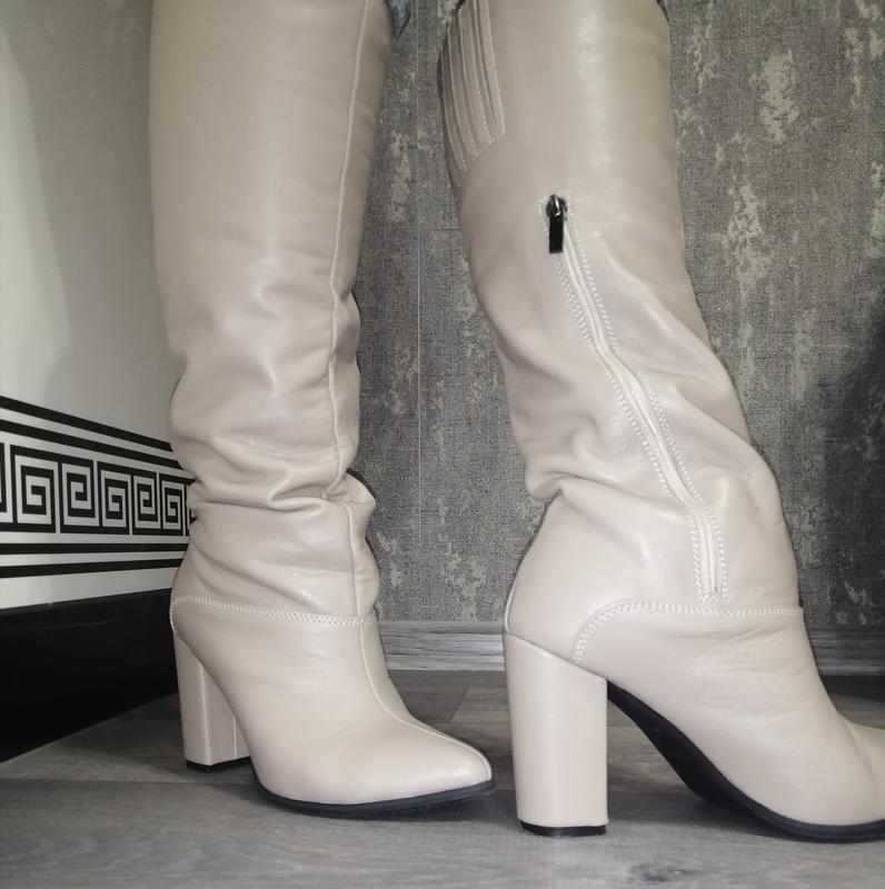 Девочки, супер модельный товар! Сапожки зимние, бежевого цвета, нарядные, с евро-мехом. Модный припуск голенища (объем голени 37, есть 4 резинки для дополнительного объёма). Высота каблука 9,5 см. Размер 38, моя стопа 25 см, входит супер, можно на носочек. В идеальном состоянии, о чем свидетельствуют фото. Устойчивая удобная колодка. Пришлю видео в мессенджер, если необходимо. Локация - районы Остров или Жилпоселок в Херсоне (для примерки). Только Херсон.