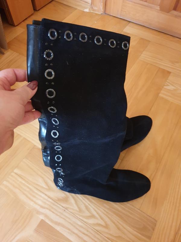 Сапоги из натуральной замши чёрного цвета демисезонные, на низком каблуке, украшены люверсами. Одевались пару раз. Размер 37