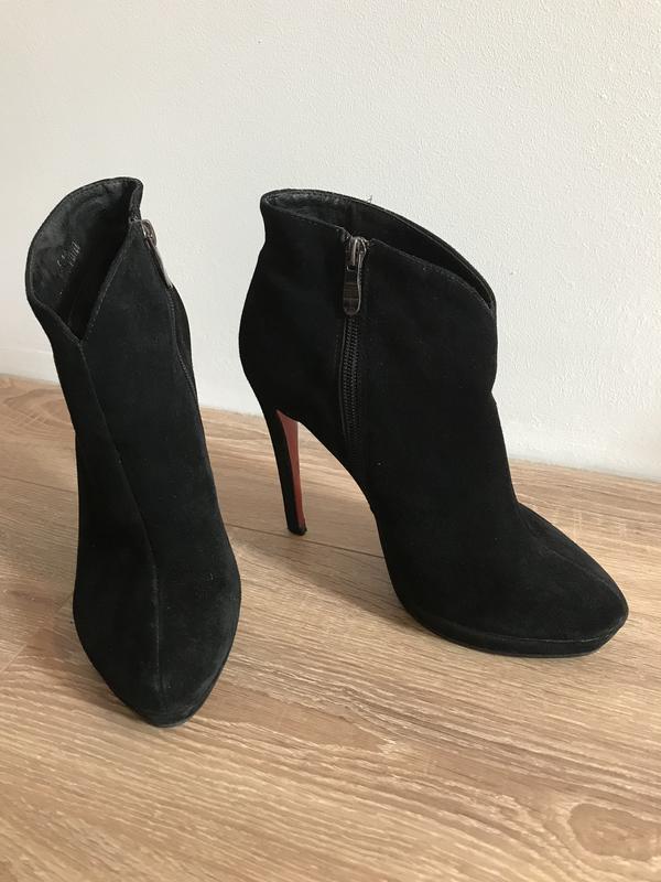 Замшеві ботильйони на шпильці Круті ботильйони з натуральної замші, за типом лабутенов, з червоною підошвою. 39 розмір, каблук 12 см, платформа 2 див. Були одягнені два рази. Є невеликі потертості на замші, при носінні не помітно. Всередині невеликий штучний утеплювач, можна носити і при -10. Причина продажу не підійшла колодка.